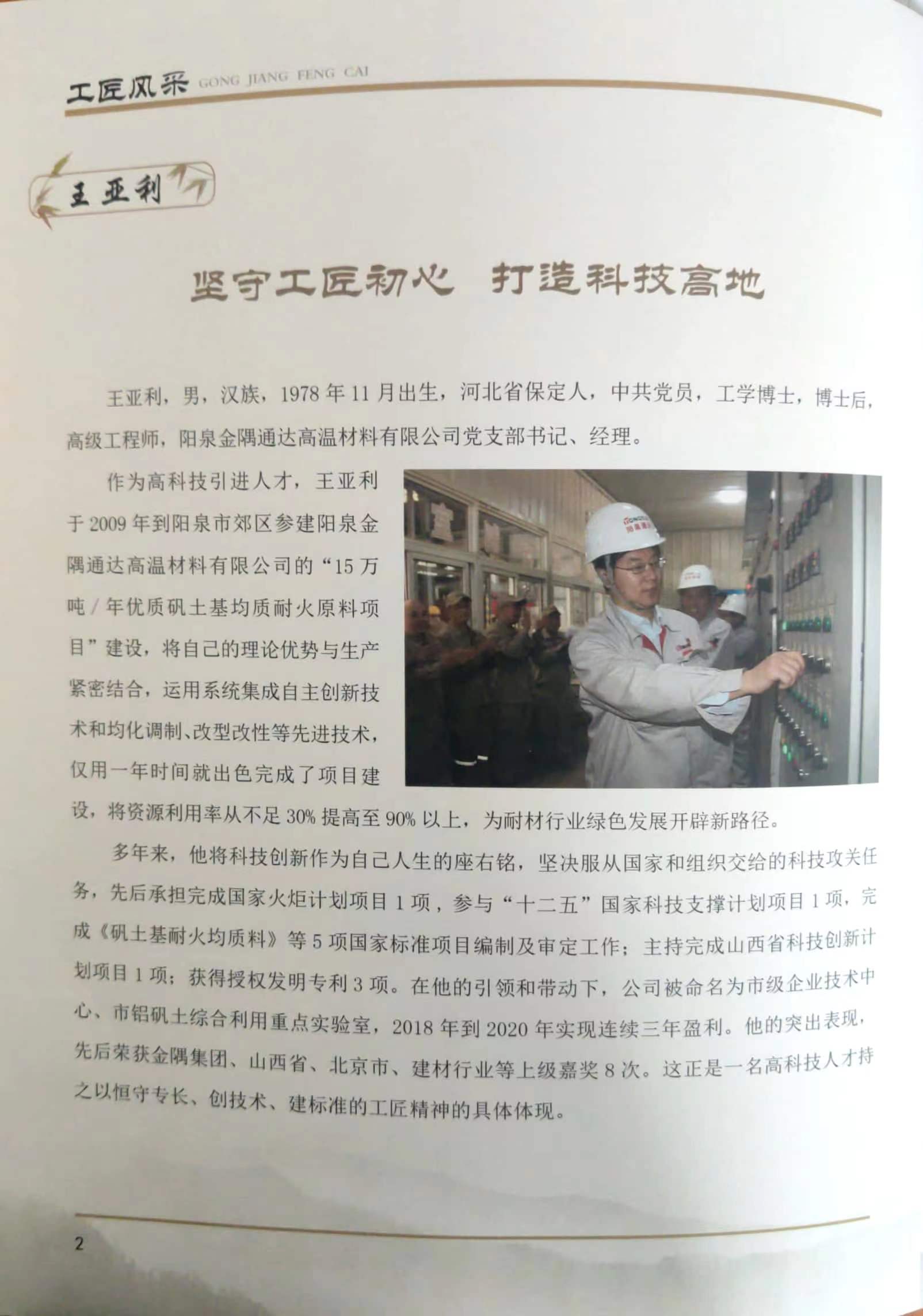 在首届“阳泉郊区工匠”颁奖词中指出,王亚利作为高科技引进人才,2009到阳泉市郊区参加阳泉金隅通达高温材料有限公司优质矾土基均质耐火原料项目建设,他干一行、爱一行、专一行,将自己的理论优势与生产紧密结合,仅用一年时间就出色完成了项目建设。该项目运用系统集成自主创新技术,采用均化调制、改型改性等先进技术,资源化利用多级品位铝矾土和废弃碎矿,将资源利用率从目前的不足30%提高至90%以上,为耐材行业绿色发展开辟新路径。
